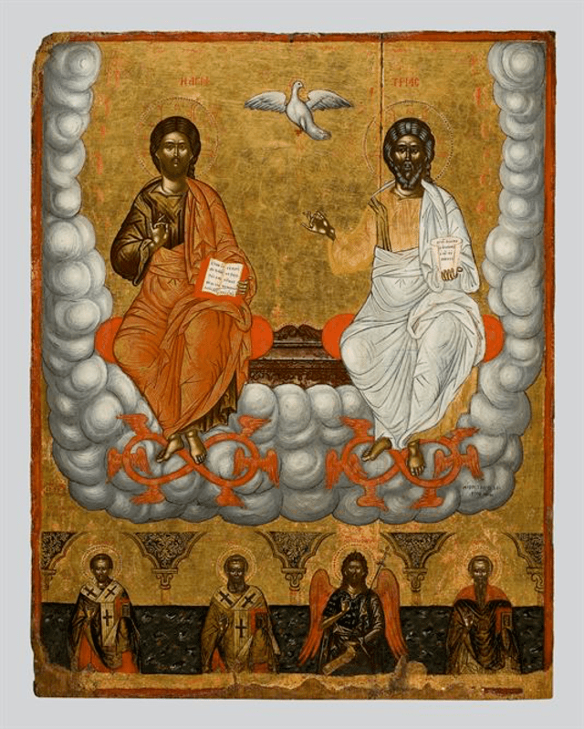 Holy Trinity with Saints Eleftherios, Athanasios, Ioannis Prodromos and Charalambos by Ioannis Skordilis, 1738 https://commons.wikimedia.org/wiki/File:Ioannis_Skordilis_Holy_Trinity_with_Saints_Eleftherios,_Athanasios,_Ioannis_Prodromos_and_Charalambos.png
