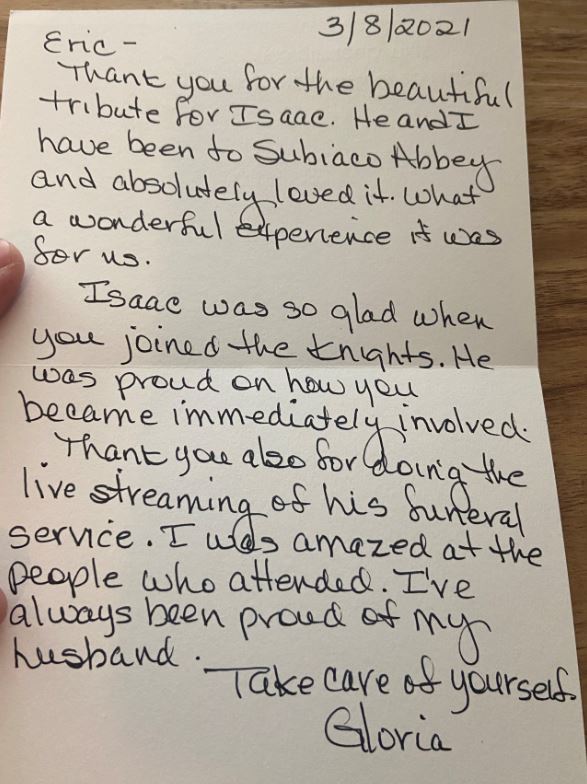 A great friend and fellow Knights of Columbus, “Sir Knight” Isaac, passed away recently from my home parish that I attend due to Covid-19 complications. I have a relative that is a Benedictine monk that resides at the Cistercian Abbey in Subiaco and thought to myself that a mass remembrance memorial seemed like the appropriate condolence card to send. After all, as Catholics, we not only view the Mass as a simple memorial feast, but the living bread come down from heaven that nourishes our very bodies and souls. It is said that choirs of angels and saints come down to earth to rejoice in such a memorial service and miraculous sacrament in the Eucharist (which means Thanksgiving).
